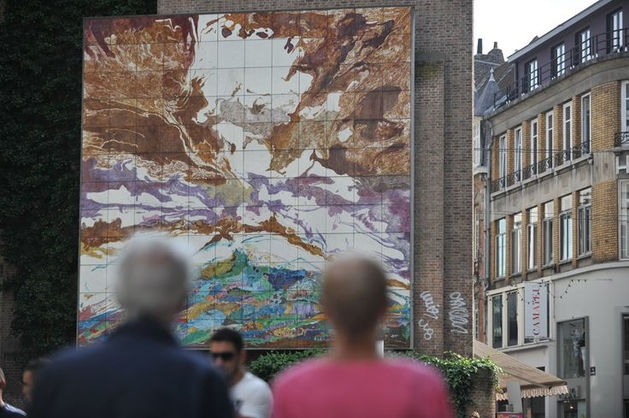 Fluid and geometrical textures warp around the elements of the Fresco on Volvic lava (1983) by Josiane Dimey located on the Parvis des Justes Oeuvre in Lille.